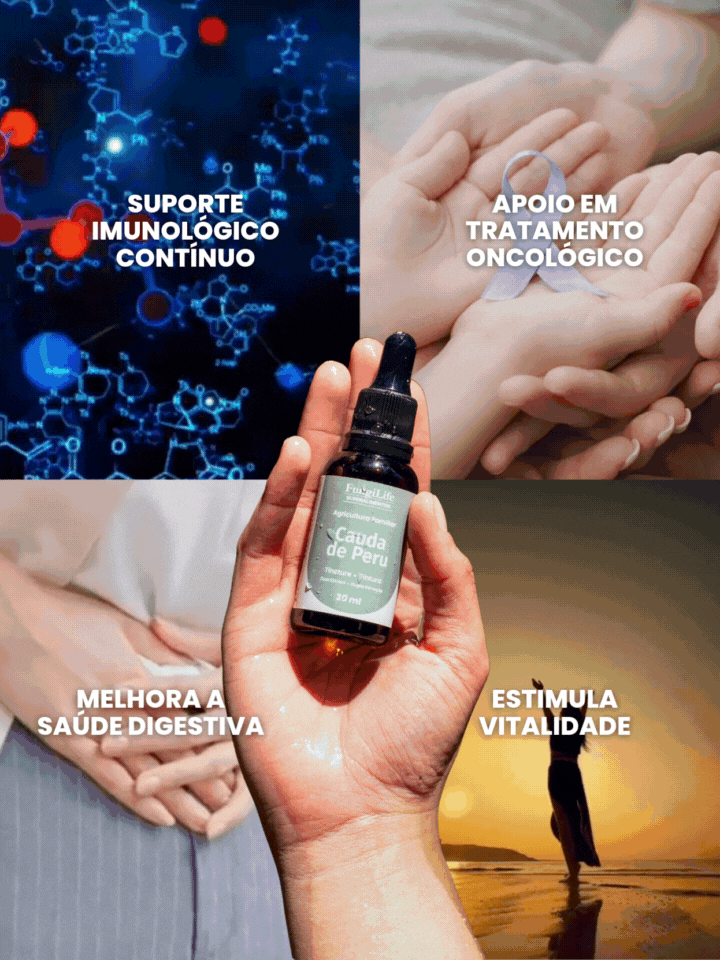 Conhecido há séculos pela Medicina Tradicional Chinesa e japonesa, o Cauda de Peru conhecido no Brasil como Cauda de Peru é um dos cogumelos mais estudados pela ciência moderna. Rico em beta-glucanos, PSK e PSP, ele fortalece o sistema imunológico, cuida da saúde digestiva e apoia o organismo em momentos de maior demanda, como durante ou após tratamentos oncológicos.