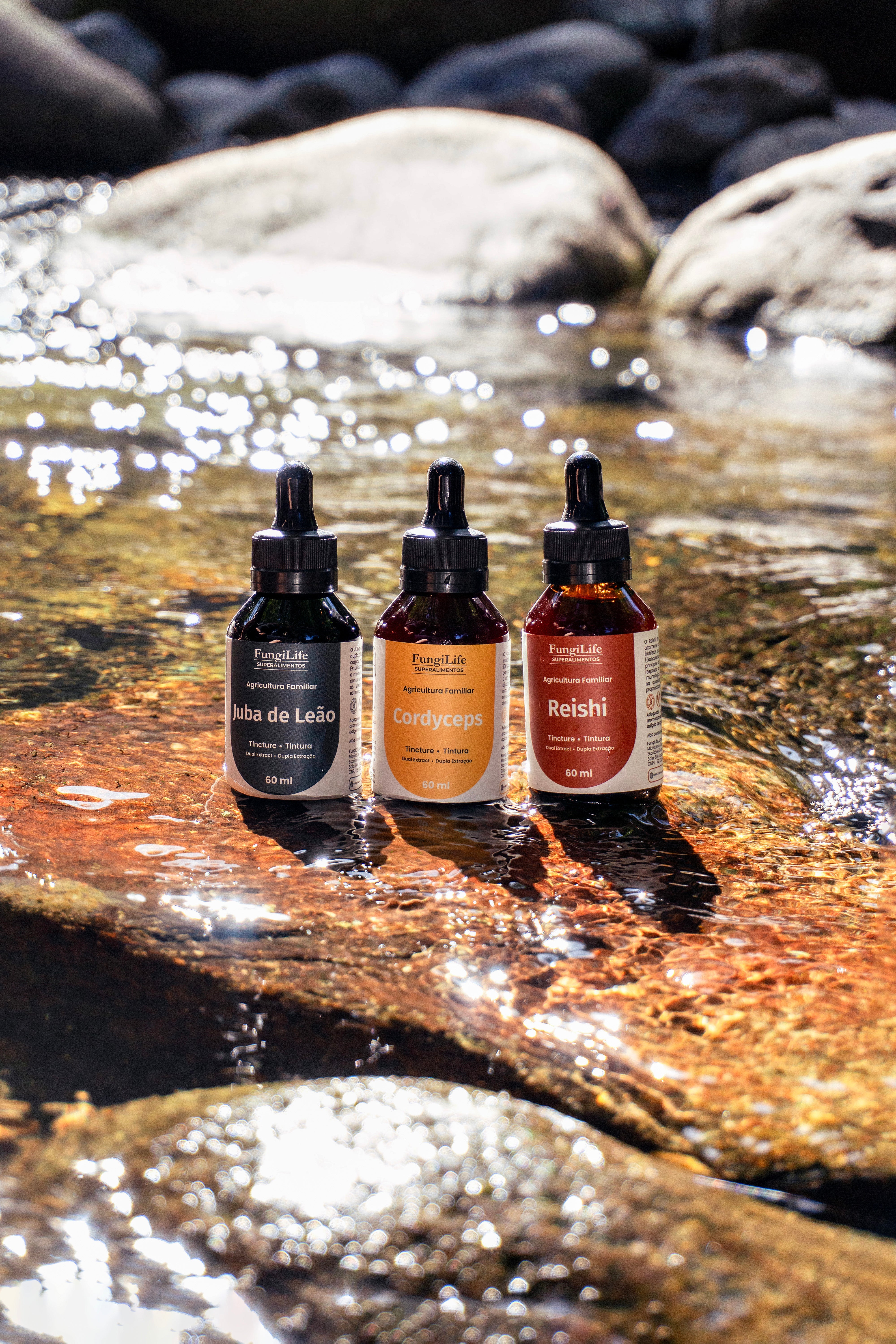 Fazemos a tripla extração enzimática: enzimas quebram as paredes celulares do cogumelo, liberando os ativos que depois são extraídos com água quente e álcool. Maior concentração, pureza e melhor absorção pelo corpo