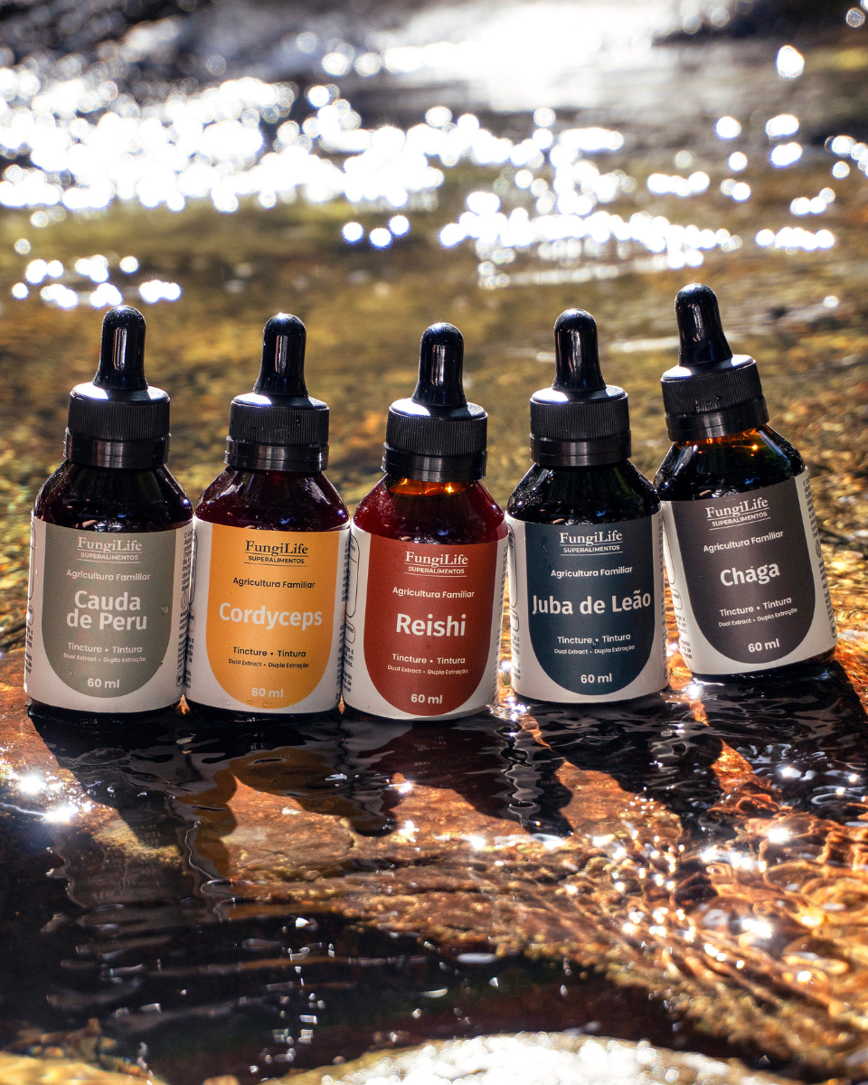 Fazemos a tripla extração enzimática: enzimas quebram as paredes celulares do cogumelo, liberando os ativos que depois são extraídos com água quente e álcool. Maior concentração, pureza e melhor absorção pelo corpo